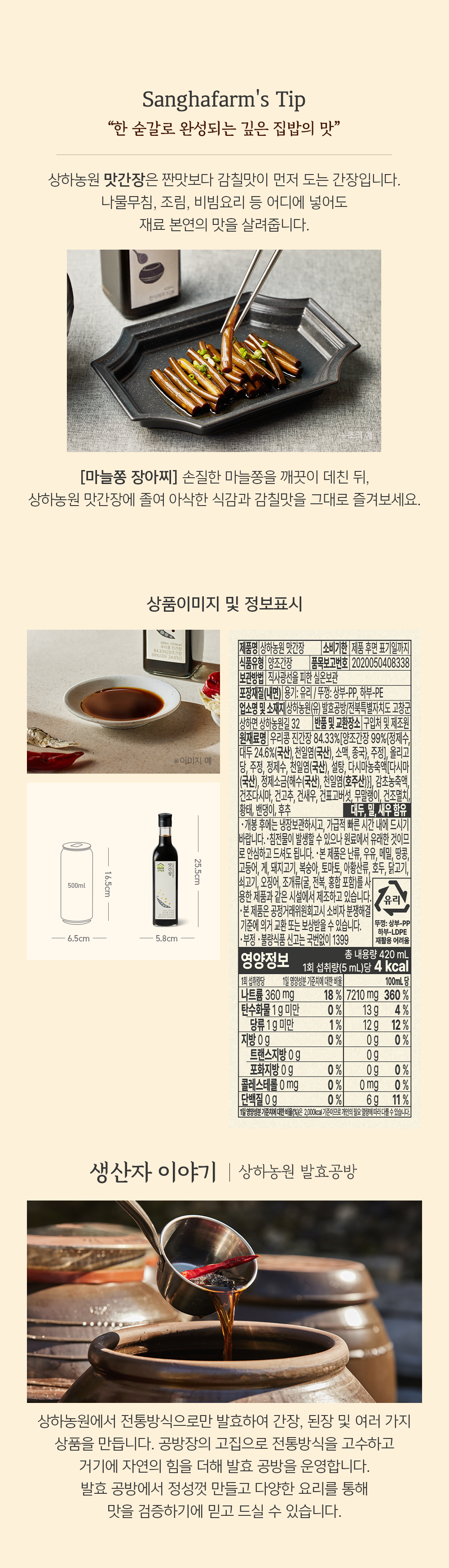 상품명 [신제품 출시기념] 상하농원 맛간장 420ml 인증여부 상품 상세설명 참고
