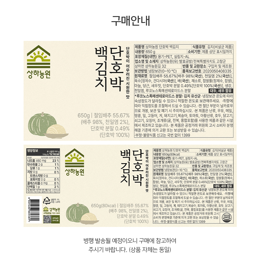 | 상품명 | 상하농원 단호박 백김치 650g (소비기한 25/12/27) |